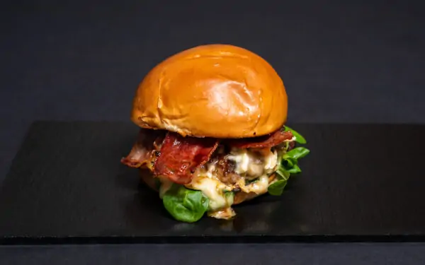 Chifla briosa 70g, carne de vita Black Angus 135g, branza camembert 30g, bacon caramelizat 30g, rucola, mustar dijon 20g, sos rodie. 6E